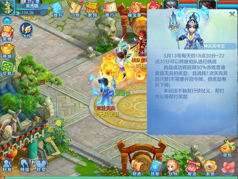 魔尊被击退,三界回复安宁,维护后至5月13号服务器等级≥55级的服务器,挑战使者将常驻英杰镇,每晚18:30~22:30可跨服组队免费挑战天兵和天魔,但只有正常挑战50%的奖励。
