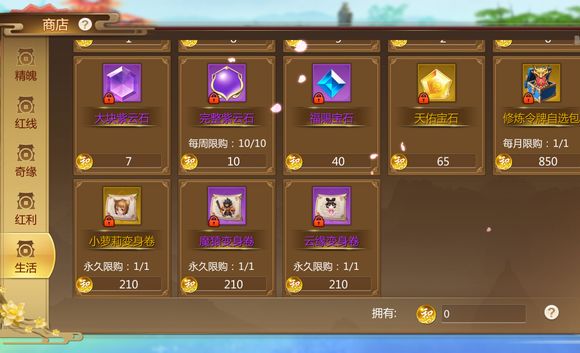 优先购买画皮银狐变身卷,还能有仙灵同伴加成。其次就是按需购买紫色鉴定石>凝炼石=炼化石>天工石。