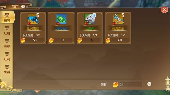 优先购买夜空蝶碎片、宝莲台碎片,如果你的帮会等级较高,可以购买小蟹将变身卷碎片。