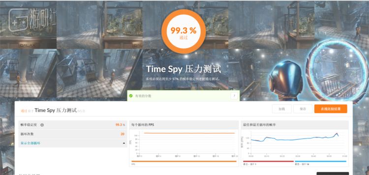 烤机测试里,半小时下来可以看到显卡的核心与显存的温度表现都很优秀。Time Spy压力测试中,99.3%的优异成绩也能证明这卡虽说看着可爱了些,散热性能还是足够的。