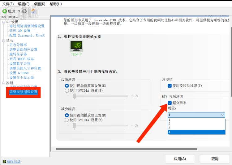 除了对新编解码格式的支持,前段时间NVIDIA还面向RTX 30、40系推出了一项新功能——RTX VSR,这是一项AI图像处理技术,它超越了传统的边缘检测和特征锐化技术,能够有效的减少视频因为压缩,而导致的伪影等画面模糊;如果你的显卡支持,只需要在NVIDIA控制面板中开启如下的选项,即可在支持VSR的浏览器或软件中体验到它。