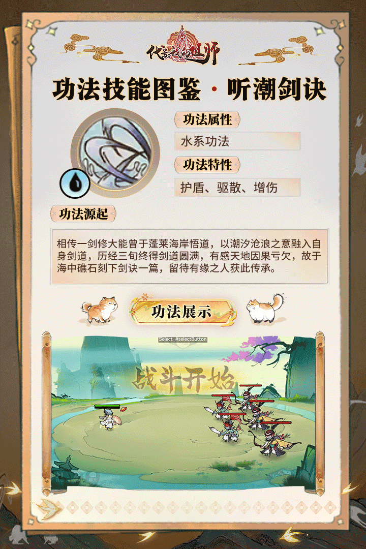 听潮剑诀:相传一剑修大能曾于蓬莱海岸悟道,以潮汐沧浪之意融入自身剑道,历经三旬终得剑道圆满,有感天地因果亏欠,故于海中礁石刻下剑诀一篇,留待有缘之人获此传承。