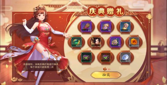 开服庆典之庆典赠礼:消耗七日目标获得的庆典灯笼进行抽奖,奖励包含各类稀有道具以及武将-孙尚香!