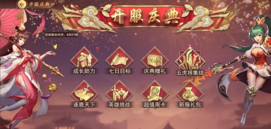 开服前期专属活动庆典!包含五虎将集结、七日目标、庆典赠礼、逐鹿天下、成长助力等七大限时活动~活动奖励满满,主公别急,看完介绍能更好的获得所有奖励哦!(*゚∀゚)=3