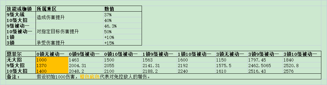 以下列出了0、1、3锁恩菲尔分别在9、10级大招和被动一情况下,对可控制敌人的增伤数据(为了方便对比,默认对初始1000伤害进行增伤),供大家参考抽取。