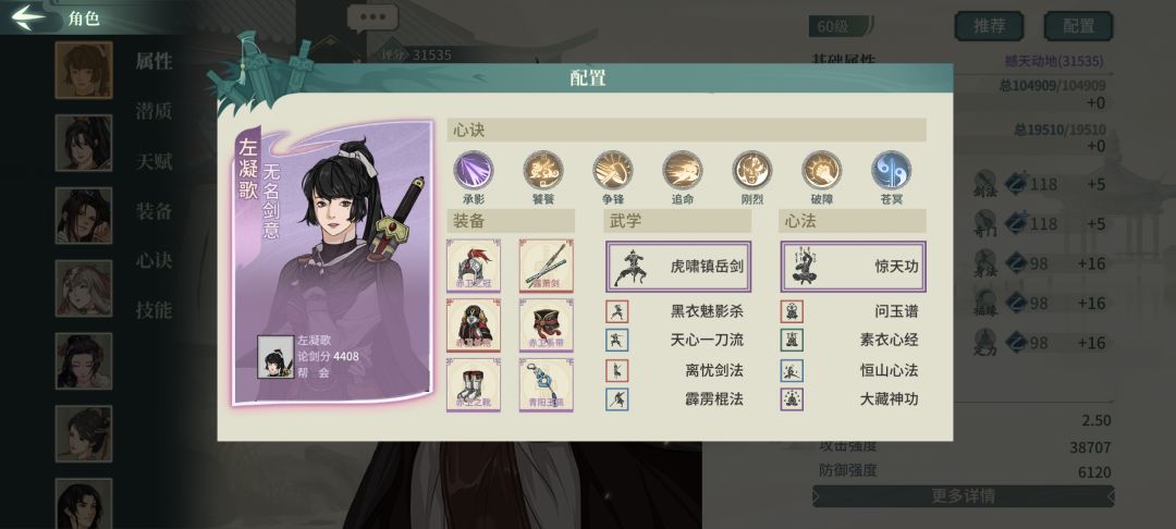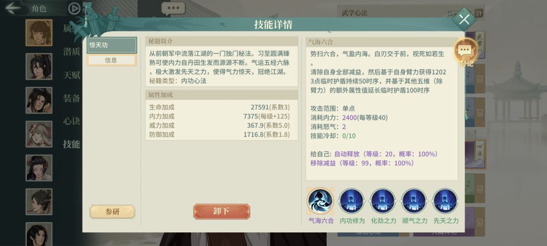 主角相对传统恒山有更高的血量和直伤和不俗的防御力,缺点和其他剑意一样怕控制怕封穴,带青阳佩稍微缓解一点顺便让惊天功临时护盾刚好150时序。