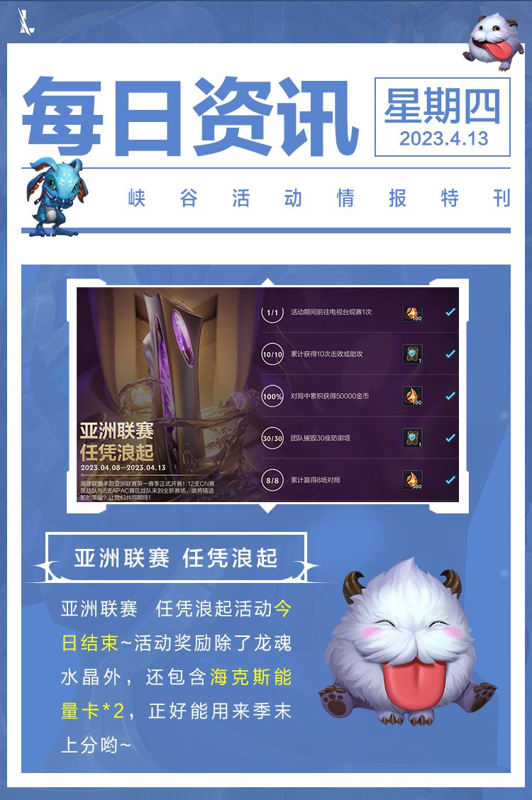 最后不要忘记今晚结束的活动亚洲联赛 任凭浪起!只需完成活动任务,就可领取海克斯能量卡*2。平时游戏内还会不定期开放其他重磅奖励活动,召唤师记得及时关注隆哥最新的爆料消息~