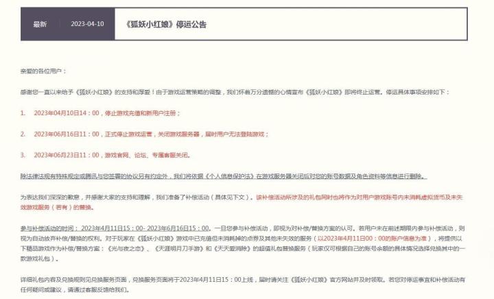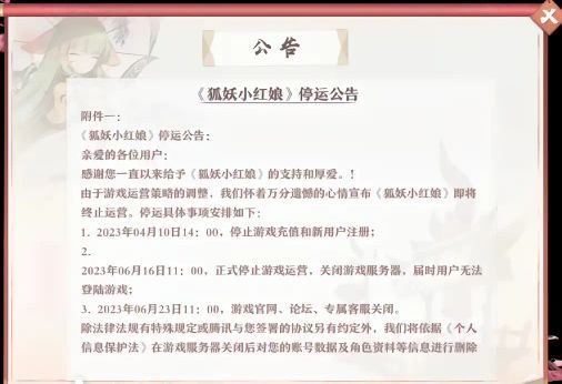 腾讯国漫IP手游《狐妖小红娘》昨日发布停运公告,由于游戏运营策略的调整,《狐妖小红娘》即将于6月16日终止运营。在《狐妖小红娘》的游戏服务器关闭后,官方将依据《个人信息保护法》对玩家的账号数据及角色资料等信息进行删除。