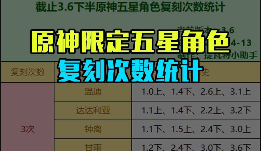 注意,刻晴、提纳里和迪希雅虽然UP过但他们并不是限定角色,因此这里暂时不作统计。并且3.6下半卡池的角色UP也已经公布,因此也算入统计。以及复刻次数不算上首发,只从第二次UP开始算。