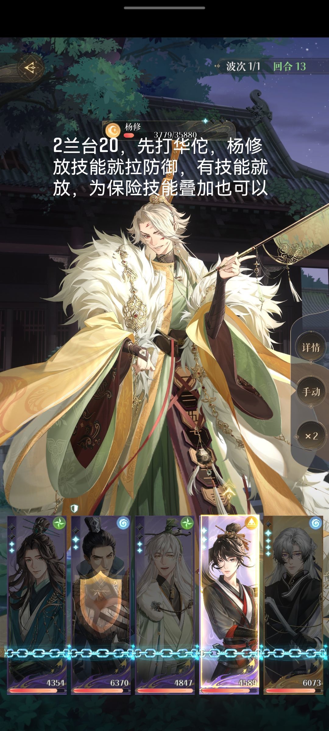 2兰台20,先打华佗,杨修放技能就拉防御,有技能就放,为保险技能叠加也可以
