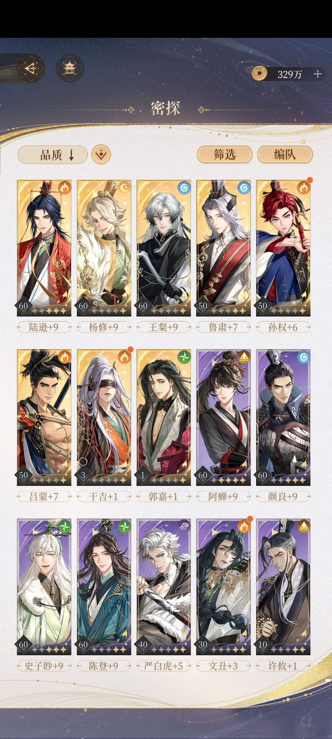 练度是60+9王璨,陆逊,杨修,颜良,狮子喵,陈登,阿蝉50+7吕蒙,鲁肃,孙权