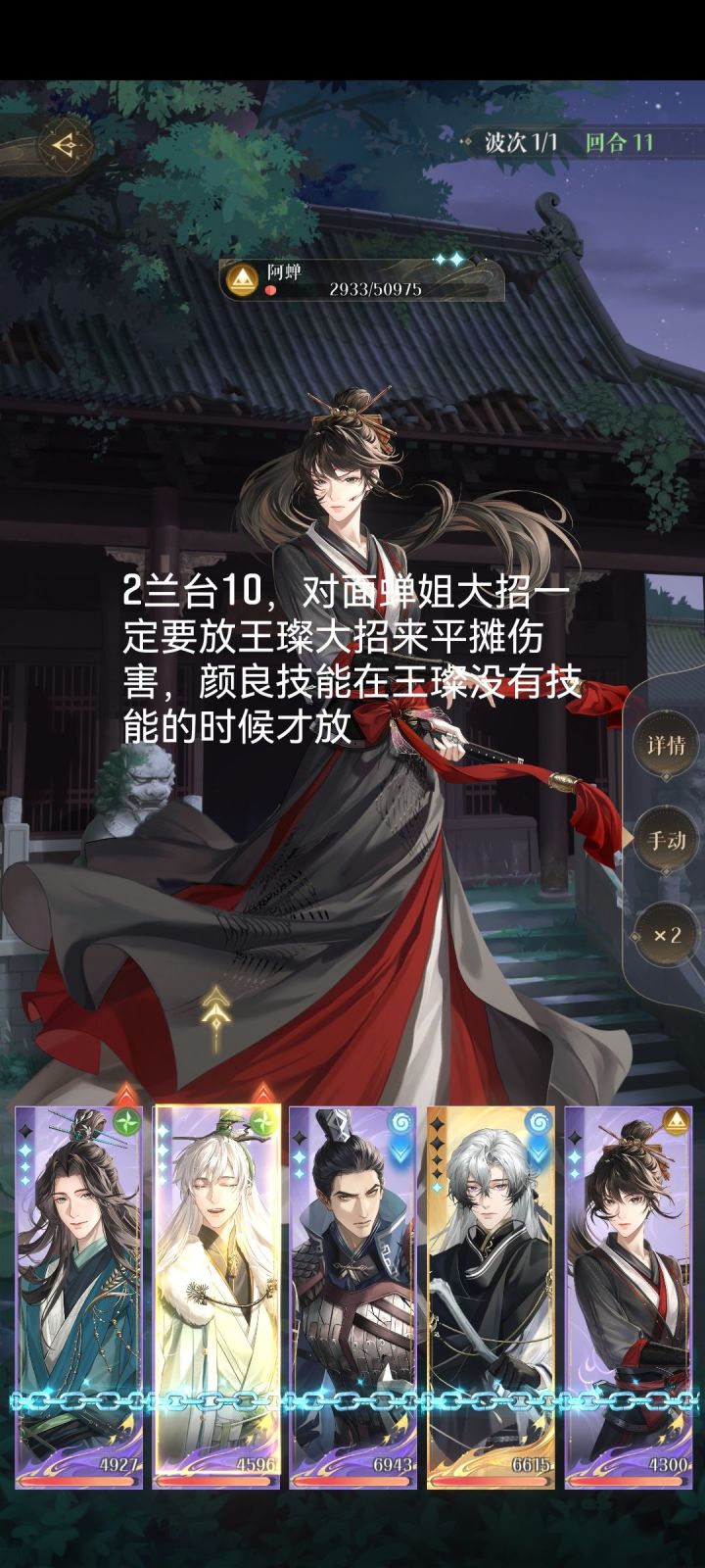 兰台3-30,王璨,杨修,颜良,狮子喵,阿蝉,杨修开局投双数会简单很多,对面放技能就防御,王璨哪怕全员满血,对面放技能也要开技能,不然香香暴击可能会暴毙一个