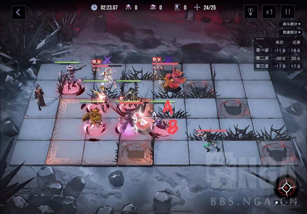 开局站位如图,等上路幽灵进入范围澈释放技能击破核心,然后女仆依次进入abb点来击剩下三个精英核心