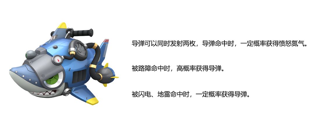 机械鲨鱼所向披靡,一往无前,被路障命中还有高概率为自身增加导弹储备,想阻碍鲨鱼的人可要小心啦~