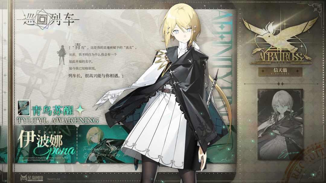 伊波娜,全名伊波娜·奥米勒斯(Epona Omelas),私营列车信天翁号的副车长。出生证明与户口原文件遗失,信天翁号持有者作为监护人与保证人为她办理了新的证件。