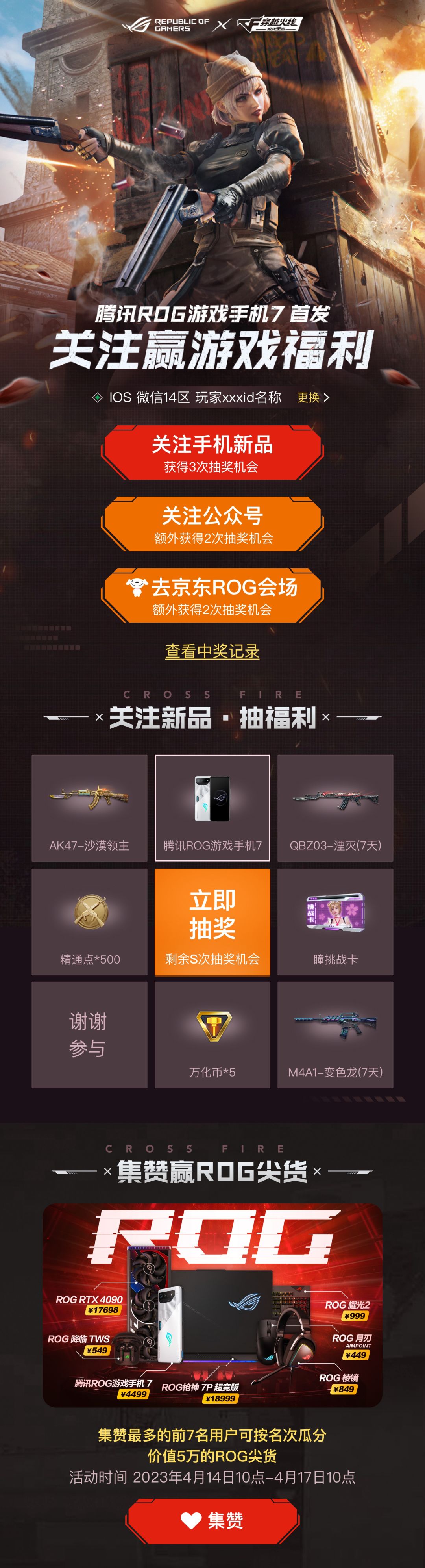 参与方式:进入穿越火线手游,腾讯ROG游戏手机7首发专属福利页面,下滑找到【集赞赢ROG尖货】,按页面提示参与活动,完成活动页面的任务,赢更多抽奖机会,更多好礼哦!前往:
