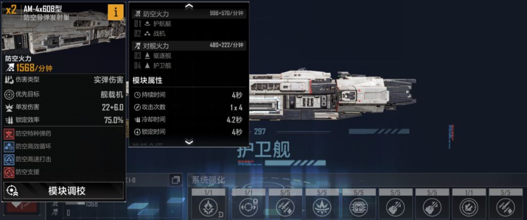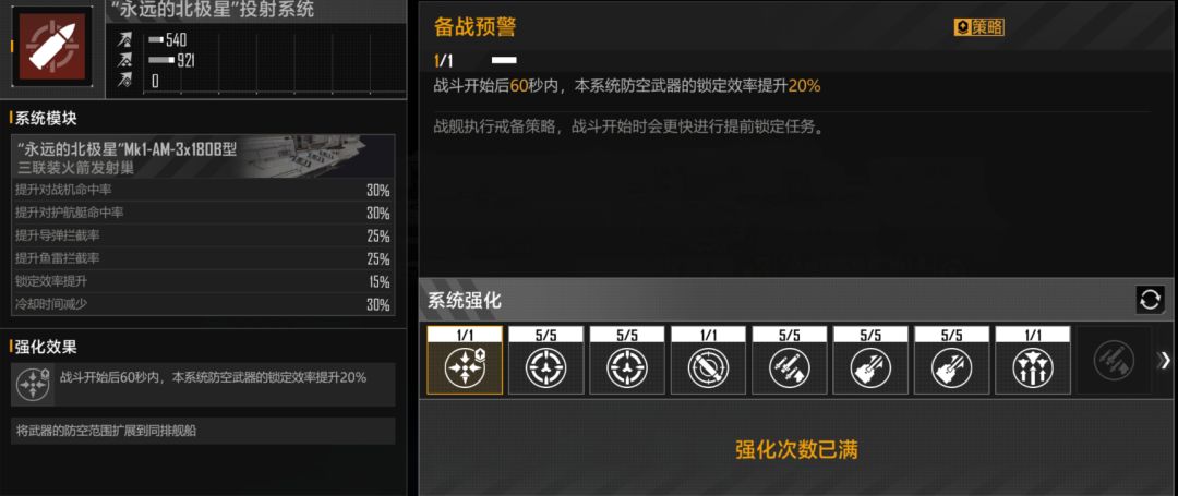 为什么动力系统要调整至后排呢?请看火炮系统策略技能,可以令全舰所有武器锁定临近排范围内对方舰船并进行行动,武器冷却降低50%,只有五秒的真空期,也就是说我们只需要将对方的舰载机集中到中排即可,那么一整局都可以吃到这个buff。