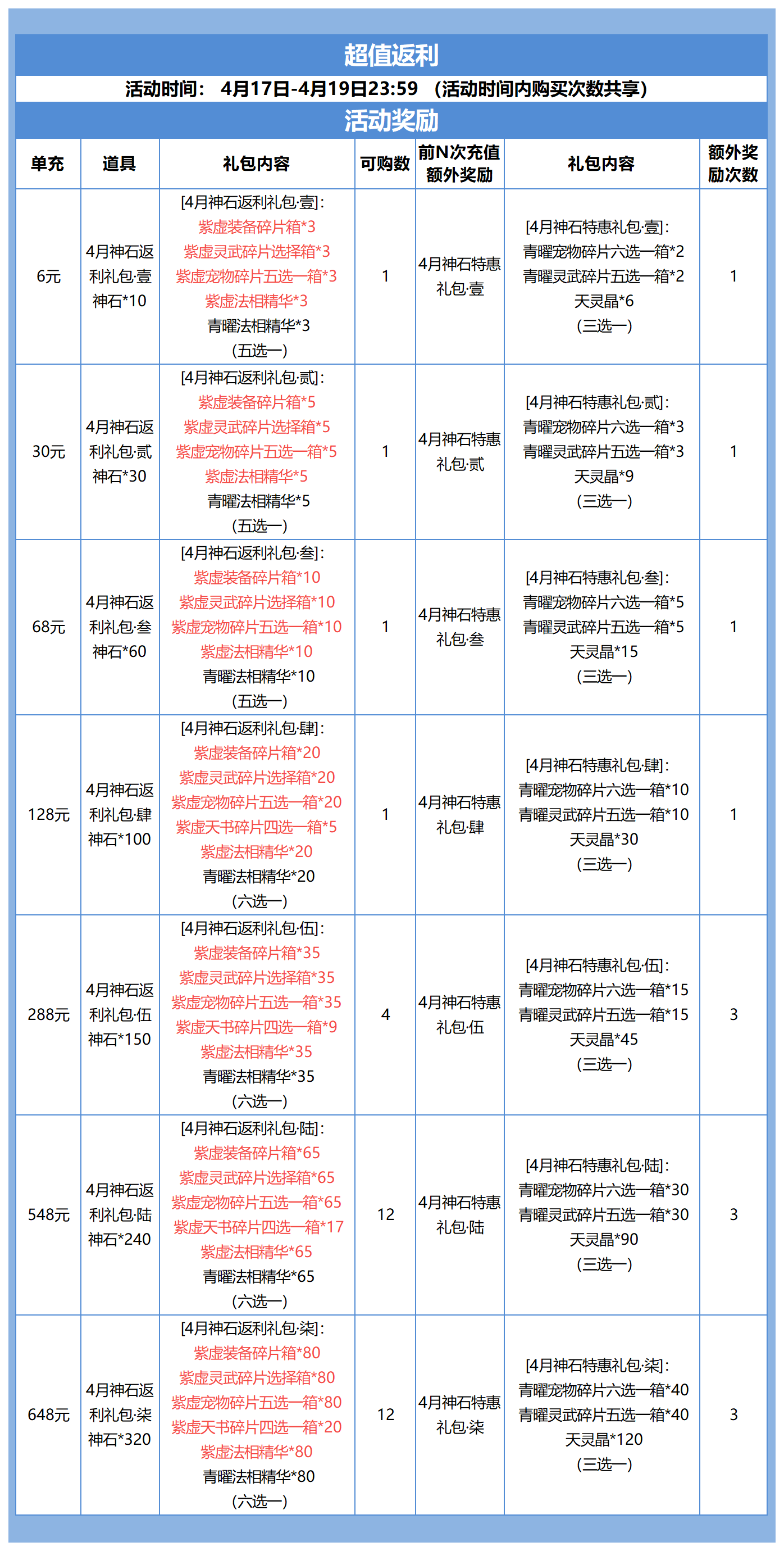 ◆活动内容:活动期间,道友单笔充值指定额度,即可领取包括紫虚宠物碎片箱、紫虚天书碎片箱、紫虚装备碎片箱在内的丰厚奖励!