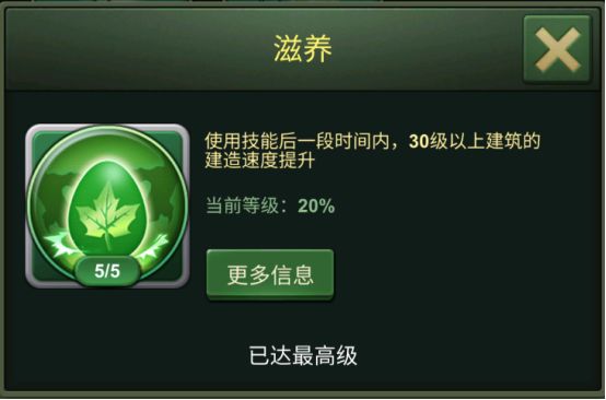 滋养:在技能[滋养]生效时间内,可提高30级以上建筑的建造速度。
