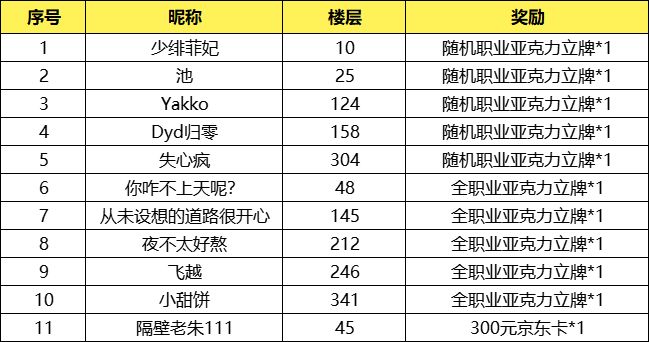 回复层数达到200楼时,将随机抽取5位幸运玩家获得【全职业亚克力立牌*1】