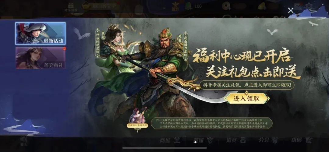 在保留原有兑换中心分区的基础上新增了抖音专属福利分区。在游戏内点击右上角的【活动】按钮,在【最新活动】分区中找到【福利中心】的宣传大图,点击该宣传大图即可进入【福利中心】页面。