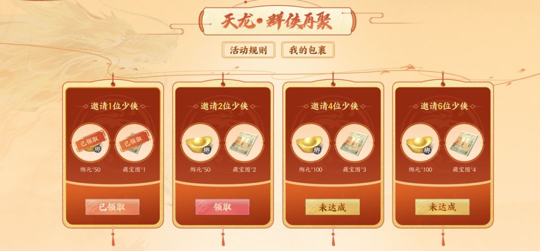 少侠们,即刻邀请曾经的挚友一起加入新天龙江湖吧~邀请人数达到指定数量,可领取对应档位的绑元与藏宝图奖励。