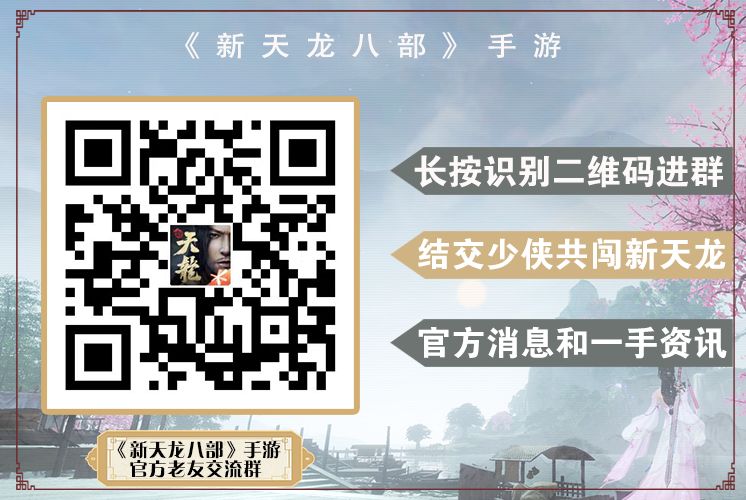 惊喜四:社群召集令,江湖动态抢先知一身转战三千里,一剑曾当百万师。那些惊才绝艳的江湖侠士,如今是否在归隐之中?老友重聚计划已启动,新天龙江湖即将开启,赶快扫描下方二维码加入官方群,第一时间知道新天龙江湖动态,结交侠士同游江湖吧。