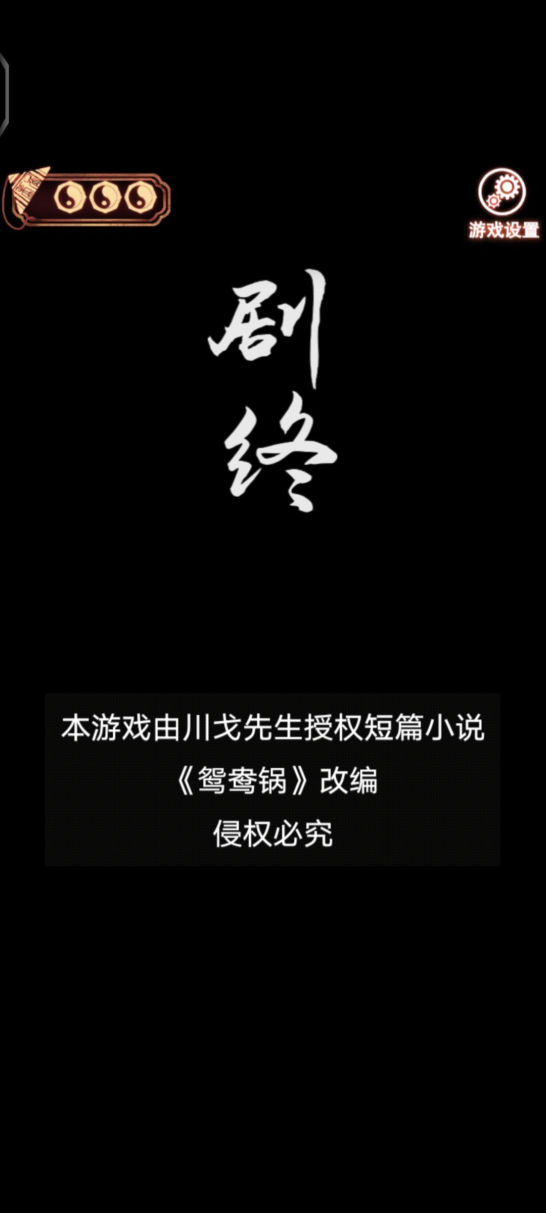 玩完了。花了三个小时,考虑到中途有事耽搁没来得及一口气玩完,还是有点遗憾。满分10分大概能给个7.5的样子。篇幅比较短,剧情也比较简单,我刚刚大概去翻了一下小说,大概能猜到第二部会讲些什么。关卡难度中等,而部分关卡有些莫名其妙,哪怕过了广告看了攻略也不明白,感觉纯粹是骗广告时长的。除了主控的心理活动基本上都有配音,大部分都是方言,作为四川人刚开始听着感觉亲切但后面就有点刻意有点“配音腔”了。最后说个题外话,由于我吃辣容易长痘痘,我还挺喜欢吃鸳鸯锅的……