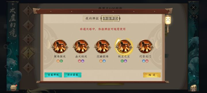 使用体验卡组中的“黄角强攻”、“沉睡控场”、“灯影龙门”