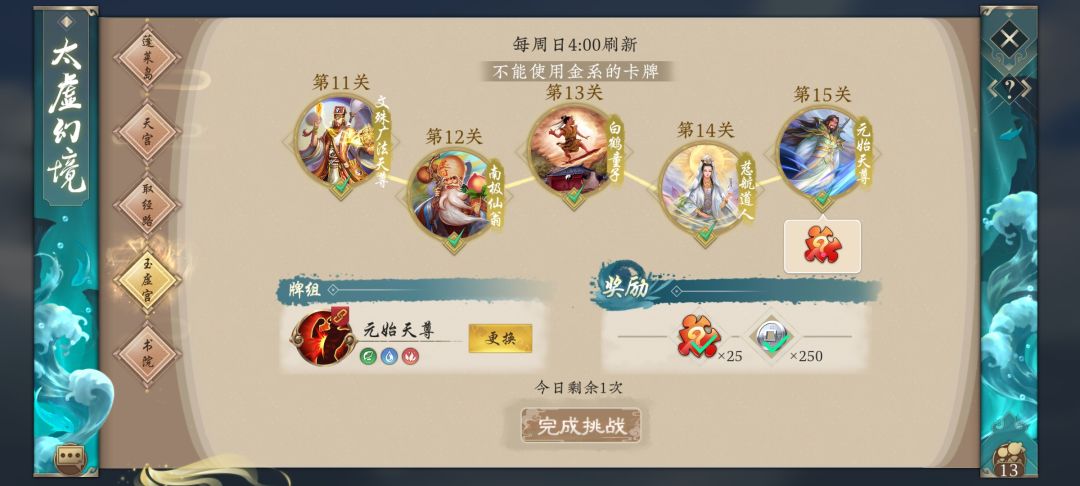 十五关 本周的元始天尊出的是混沌兽,收到伤害衍生小怪。因为本周禁用金系,我那个不同寻常的金火就用不了了,搞了一套水木火穿透,核心寒冰天君(镇元大仙凑数用的)火系用来补伤害、木系给寒冰天君加攻击。
