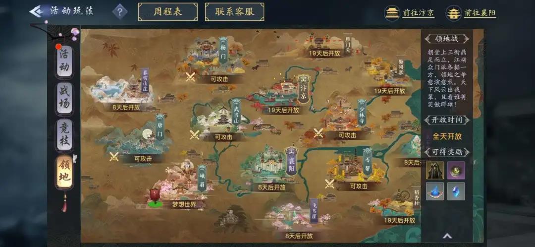 2、活动开启后,领地解除进入限制,少侠们可根据不同的领地战规则,参与领地争夺活动;