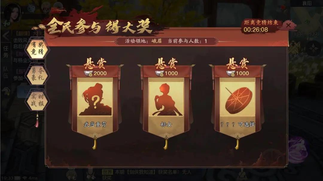 在门派领地争夺战倒计时期间,少侠们可通过消耗指定数量的绑定银两,在活动竞猜页面投选当日活动题目,每位少侠只能投选1个选项,且仅能投选1次,投选完成会被记录在当前的页面中,当门派领地争夺战结束后,竞猜活动也会进行相应结算,按照竞猜结果发放对应的奖励。