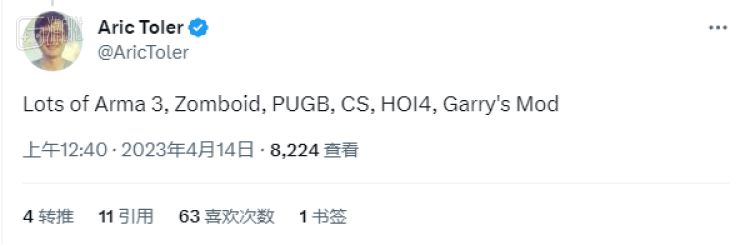 另据调查员托勒的一则推特回复,特谢拉的Steam库里有不少热门游戏,包括《武装突袭3》《僵尸毁灭工程》《绝地求生》《反恐精英》《钢铁雄心4》和《盖瑞模组》。