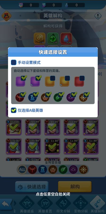 (2)解锁了【英雄解构】功能,且条件3:玩家满足主线关卡通关26-40 ,可以解构s和s+英雄,卓越及以上的a级英雄出现在解构列表,可以解构