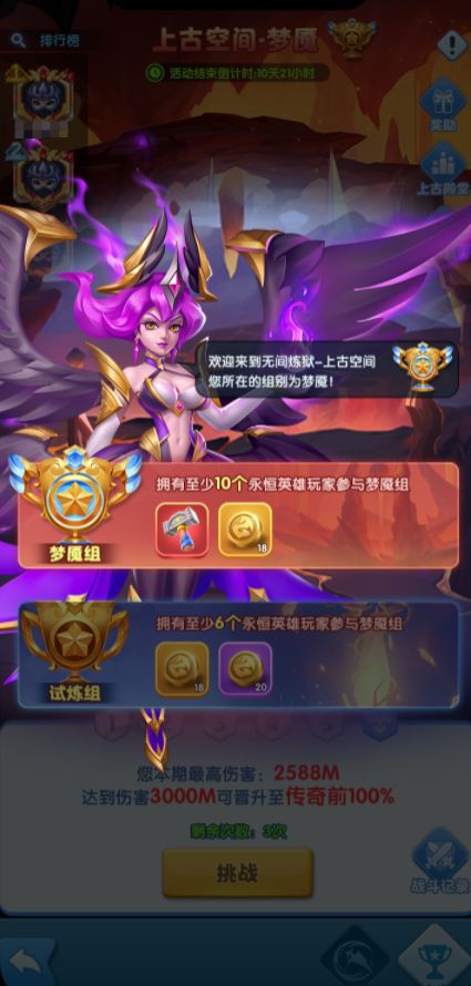 1.上古之地每7天开启一次。分为2个分组的空间,将会根据玩家当前英雄养成进度匹配到对应阶段的空间进行挑战。