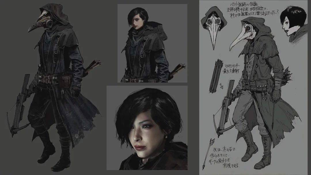 据了解,卡普空最初想把艾达王带进到《生化危机8:村庄》中的,据设定集介绍,原本艾达王会乔装为瘟疫医生,戴着鸟嘴面具、拿着十字弩潜入调查村庄,并在某个时刻救下主角伊森。但最终这因为剧情冲突而取消了。