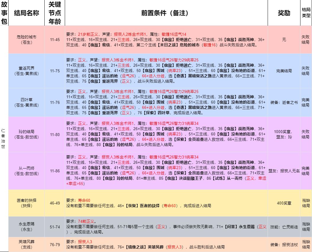 由于仁者故事包主线占据大部分,所以文档用双主线,三主线来标识该年龄段有多少事件是必须完成的,如果没完成那将不会触发后面的主线。有时候主线会被其他支线占位,所以没做完当前年龄段主线前尽量选支线,别选通用包事件。51+会有苍生三主线和永生单主线及两条支线,推荐把永生线接取,防止断主线。