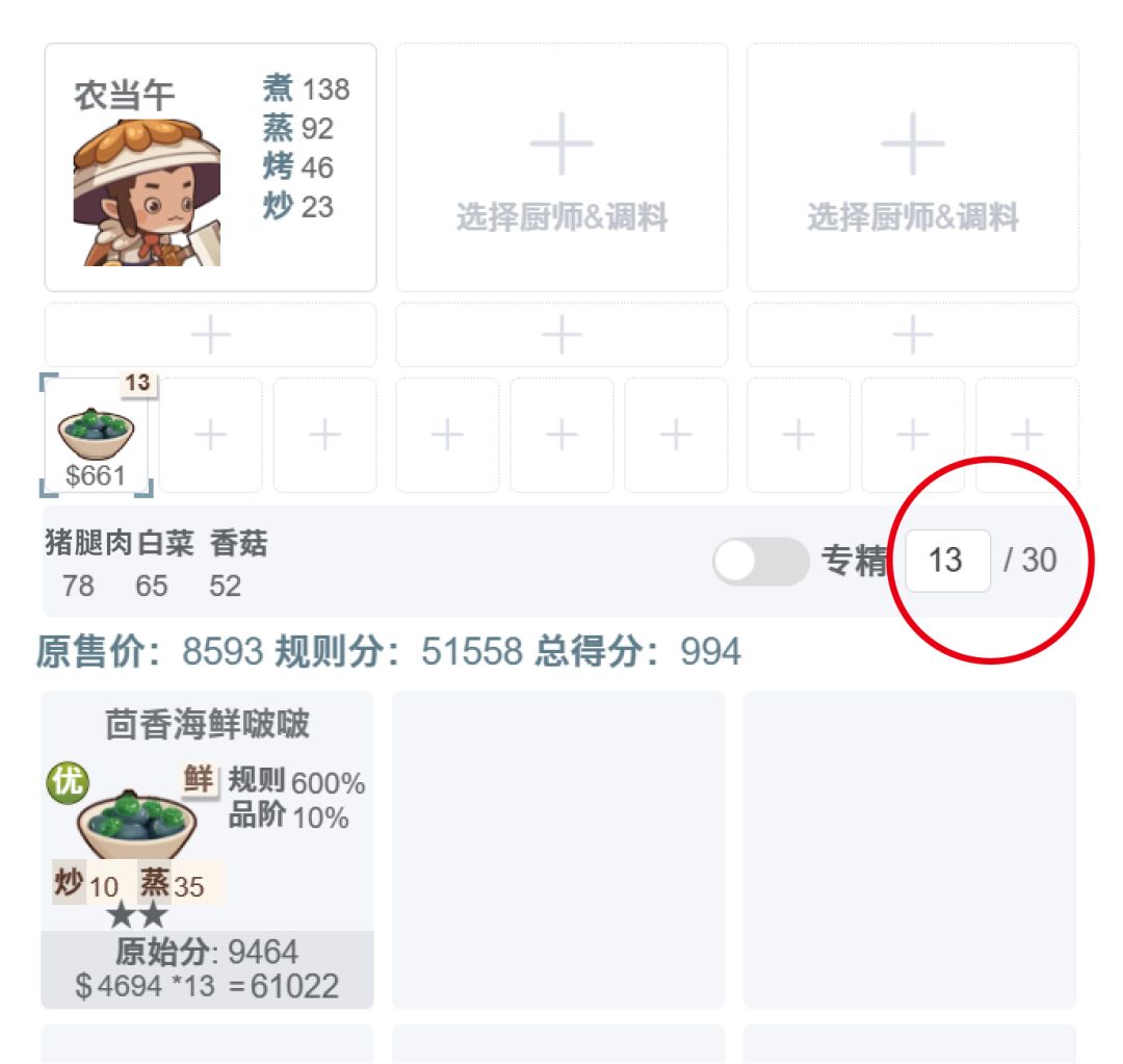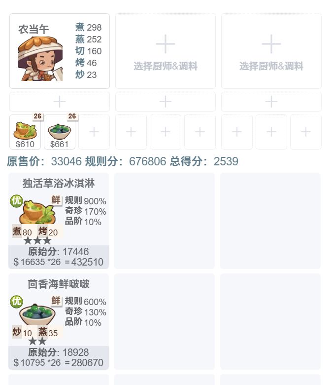 5菜谱+2厨师均分:1967(很极限的,新手想拿2厨师比较梦幻,涉及的因素也很多)
