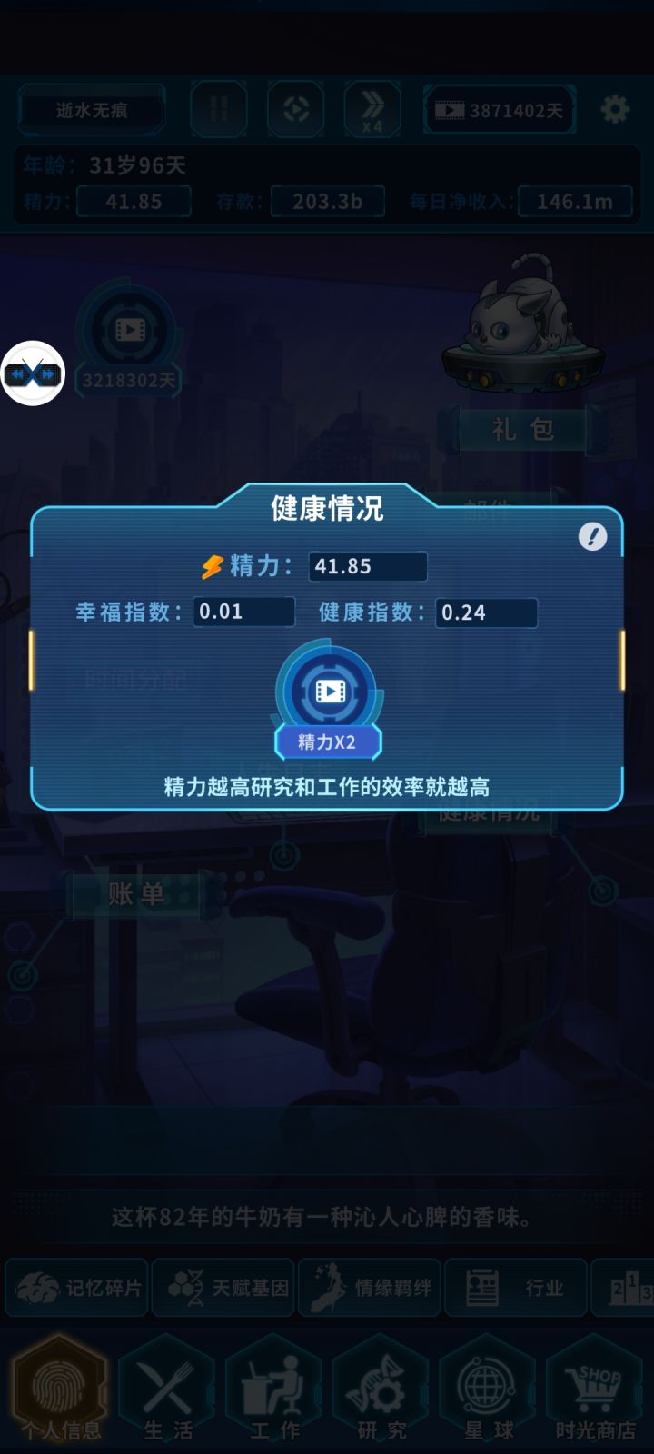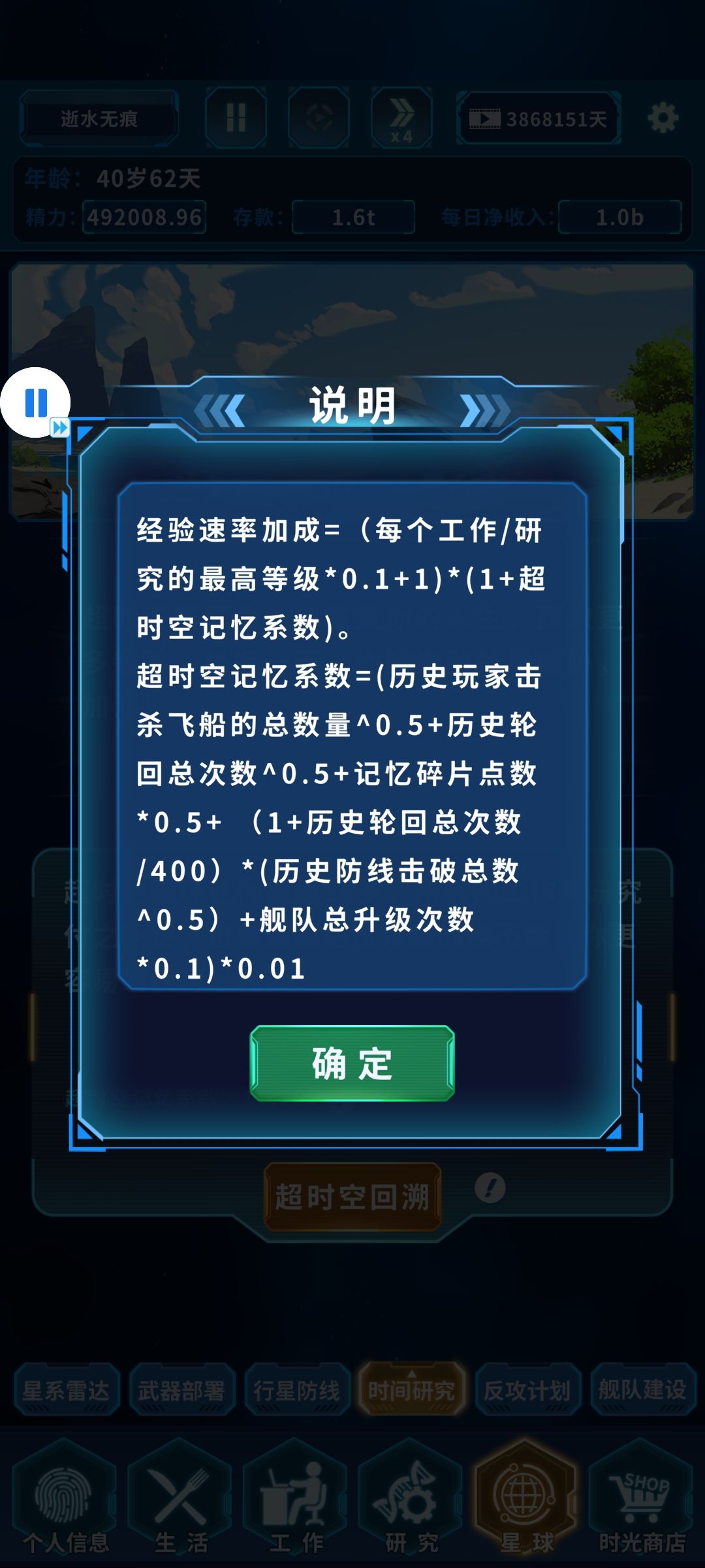 本游戏是以轮回系数叠加倍速来完成高难度任务.赚钱速度.就是超时空系数=工作倍速和研究倍速