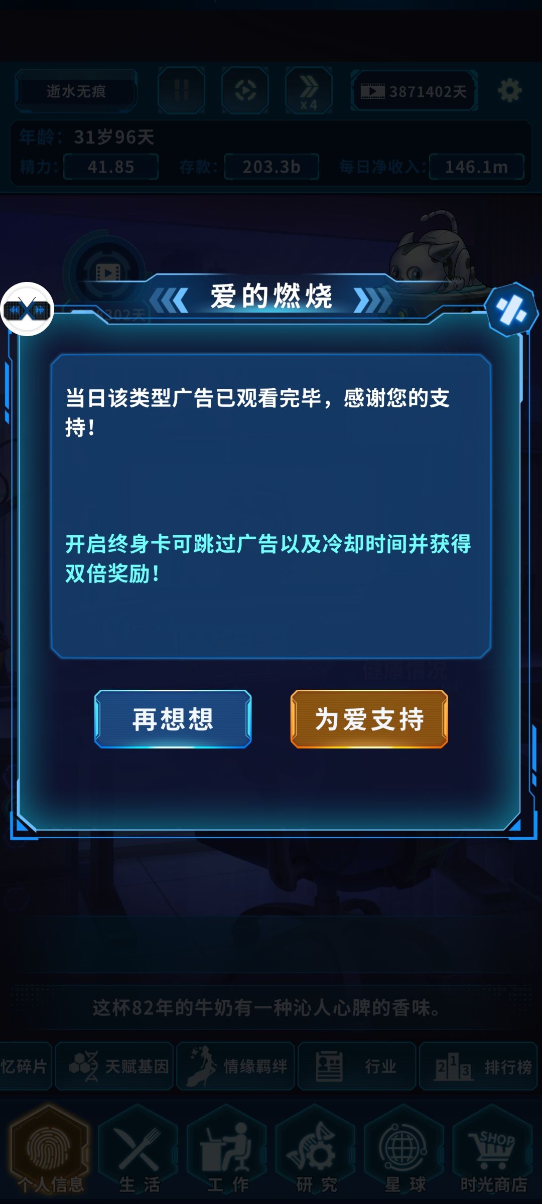 这时:千万别买商业皮肤(巨坑).千万别买商业皮肤(巨坑).千万别买商业皮肤(巨坑)重要说三次(后面解说为什么不买)玩到这里知道九大+效率+精力的重要性开始选天体以上从上到下点一下!看看那个科技加效率的!重点升级(轮回最高等级=倍速)