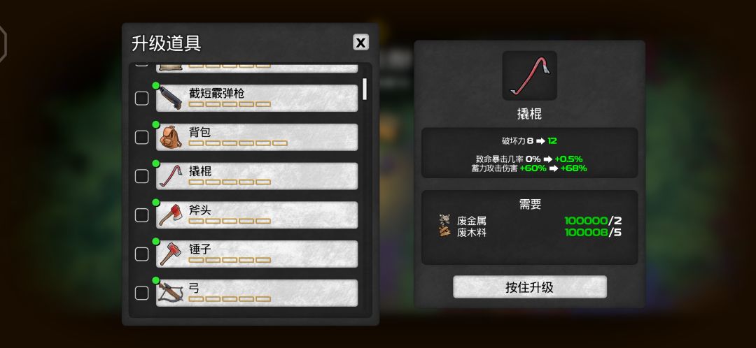 新手陷阱武器,升级材料在前期都不好获得,很卡手,忍一忍过渡到棒球棒,拉满棒球棒攻砸一体。砍大轮胎需要40破坏,所以升两级就够用。