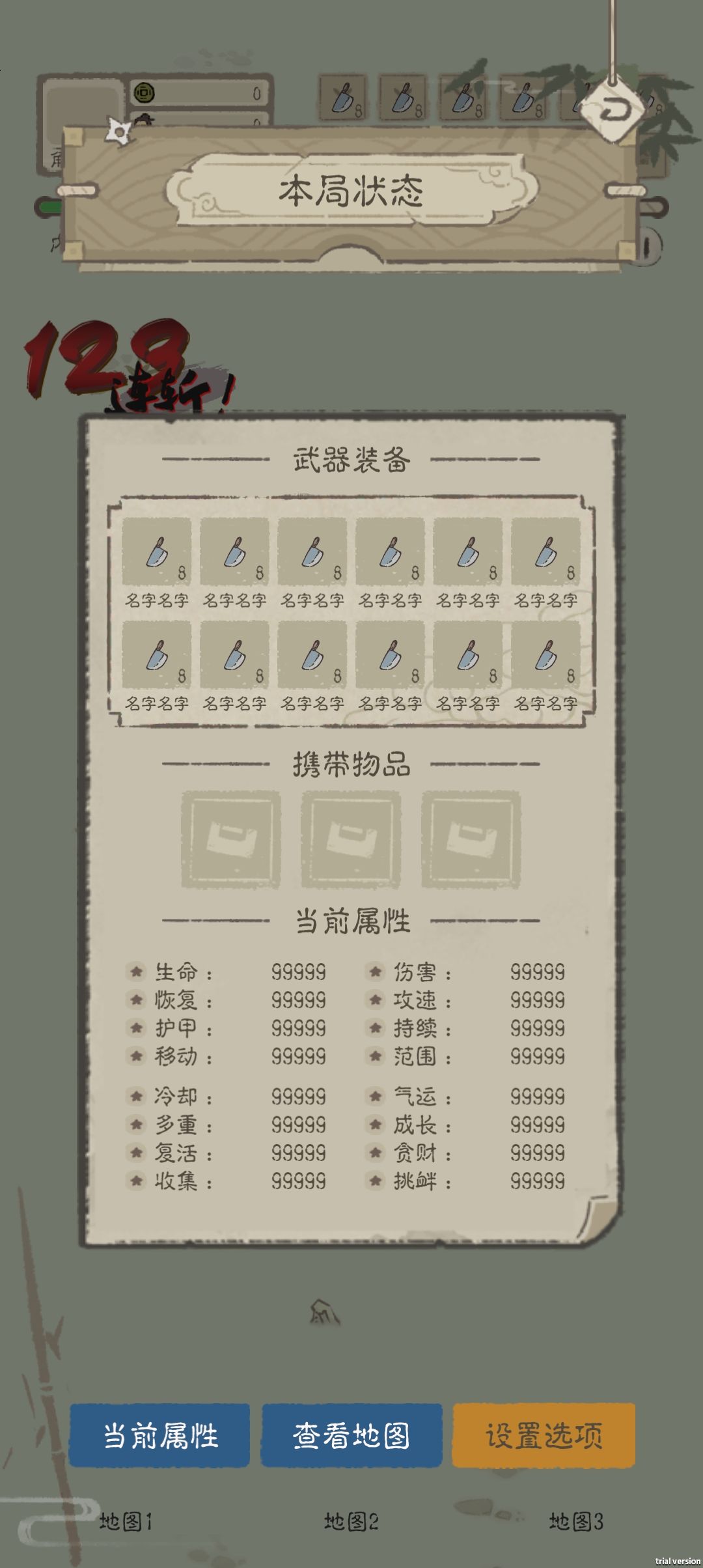 武器种类还有天赋有点少,各武器的效果不错,局内升级选择时,不同武器需要的升级超武天赋都直接显示了(好评),升级超武后武器完全变了样,比如金箍棒是打狗棒的超武、菜刀超武是大铡刀;