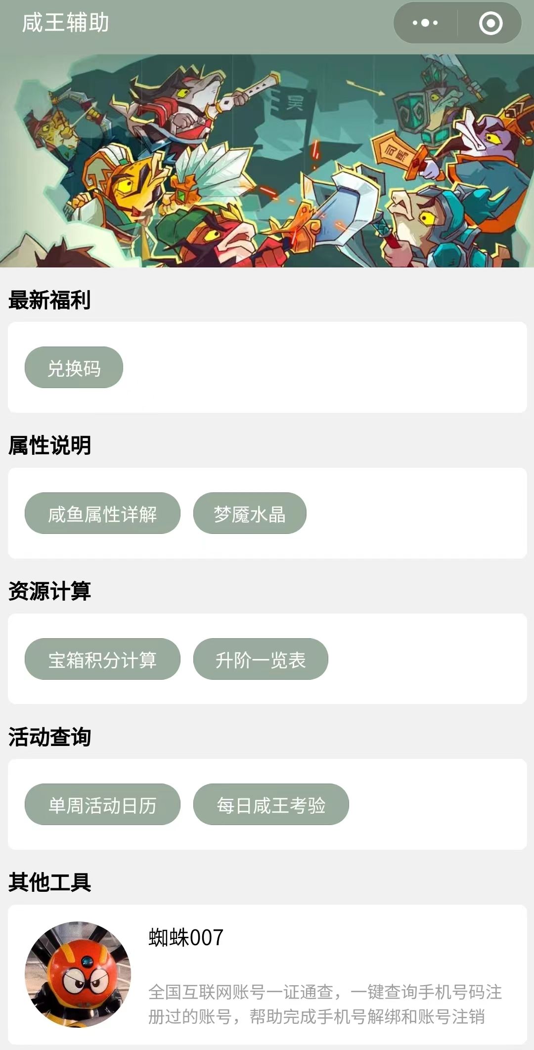 提供咸鱼之王辅助和游戏攻略,包含礼包兑换码、宝箱计算器、活动日历、答题练习、阵容推荐、淬炼模拟等功能。