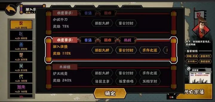 第五个词条孤掌难鸣:叛乱爆发时,除去汉和首先造反的藩王势力,其他藩王势力变成勤王军。个人认为,有些鸡肋,只要一开始让造反的人变多,这个词条就是形同虚设。