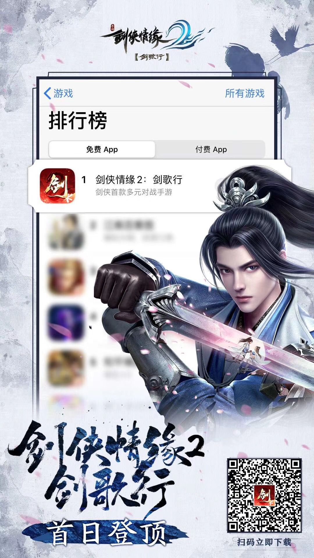 恭喜《剑侠情缘2:剑歌行》开服首日即登顶排行榜~立刻下载,即可加入武侠打大世界~小欢期待与你相遇!