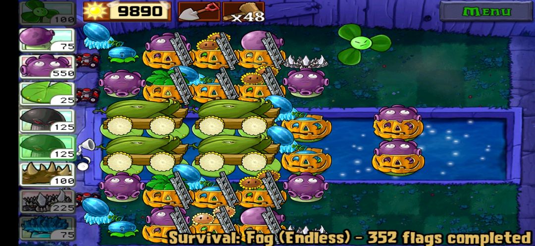 优点:无伤旷工,小鬼,海豚僵尸,阳光收入允许忧郁蘑菇和地刺王的更换,战线长,不怕小丑缺点:当小丑意外爆炸且没及时补上水里的忧郁菇海豚会直接啃掉炮,很伤。打红眼需要在水道前四个位置配合4炮放毁灭菇(4个位置,可以循环填坑)注意:4炮建议拖射不要点射(太容易失误炸毁梯子),不要将毁灭菇放到最后一个格子里(很容易不小心点到就在地图上爆炸位置只要在倒数第三行就会炸毁梯子)