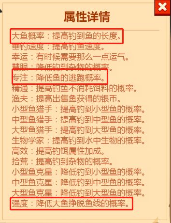 首先我们需要了解一下钓鱼基本的三个属性:鱼竿自带的大鱼概率、鱼线自带的强度、鱼漂自带的专注。这三个属性,大鱼概率提高钓到的鱼更长的几率,强度降低大鱼挣脱的概率,专注降低鱼的逃跑概率。