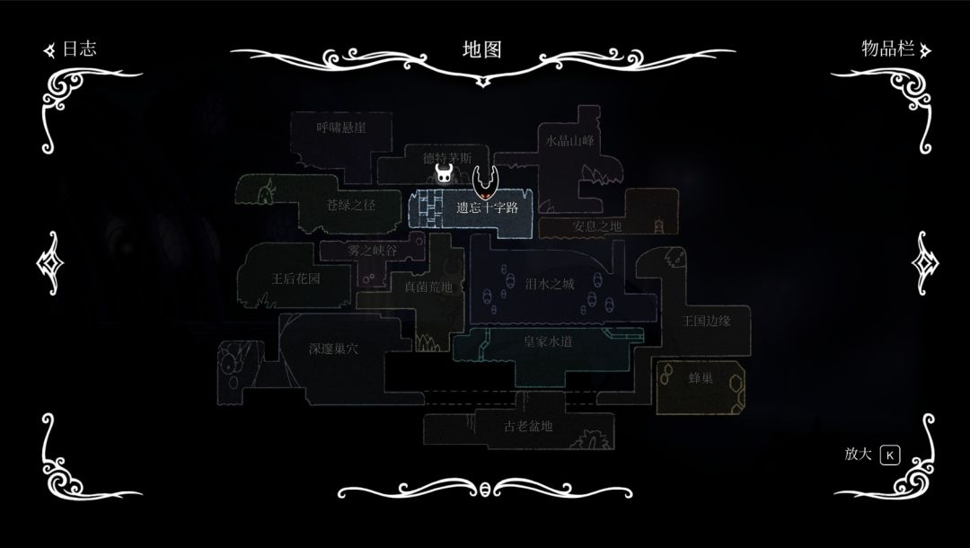 空洞的地图真心来讲,非常非常大,远超过我上次帖子提到的镜之大迷宫。坦白来说,一开始看到我朋友直接扔给我的这个全收集图文我慌了,因为从镜迷遗留下来的习惯让我偏向高收集度去打boss,然而看了攻略图我一瞬间打起了退堂鼓,真的太大了,不知道要打多久。虽然,地图的设计真的很棒,全地图是完全连通的,就算不用鹿角车站和电车站,用腿也能走遍整个圣巢王国,除了极少数独立地图。