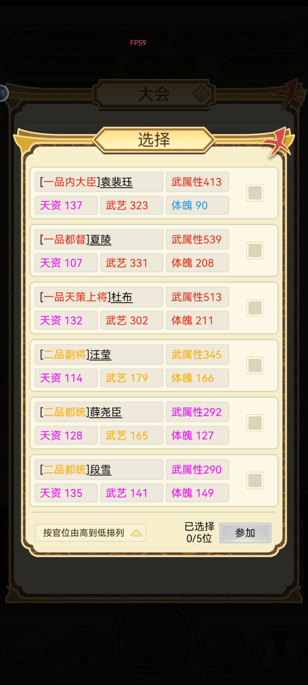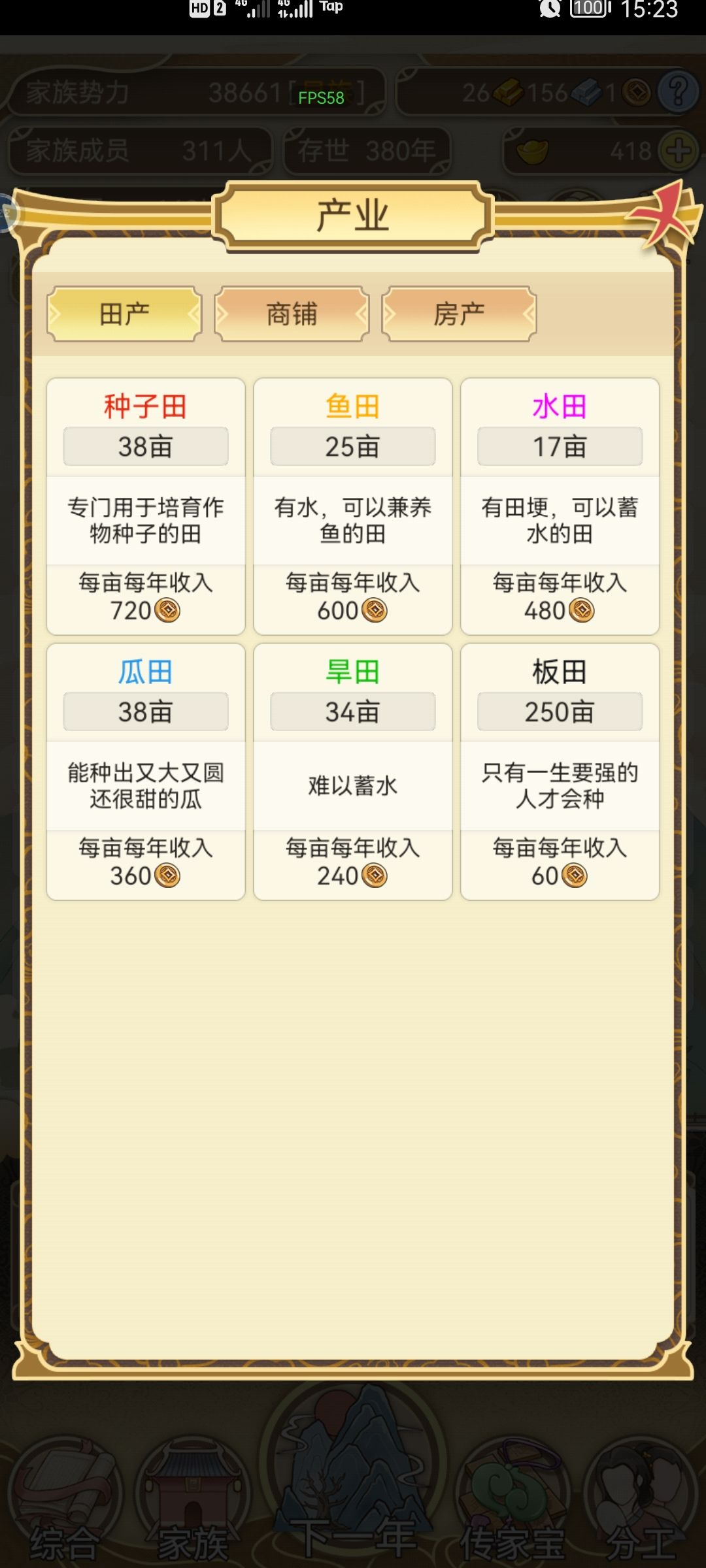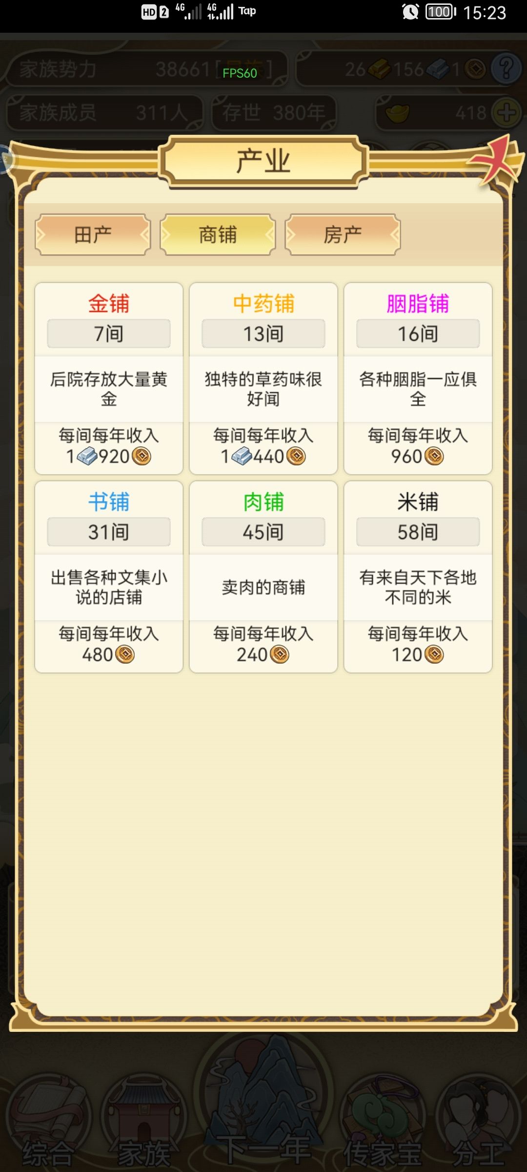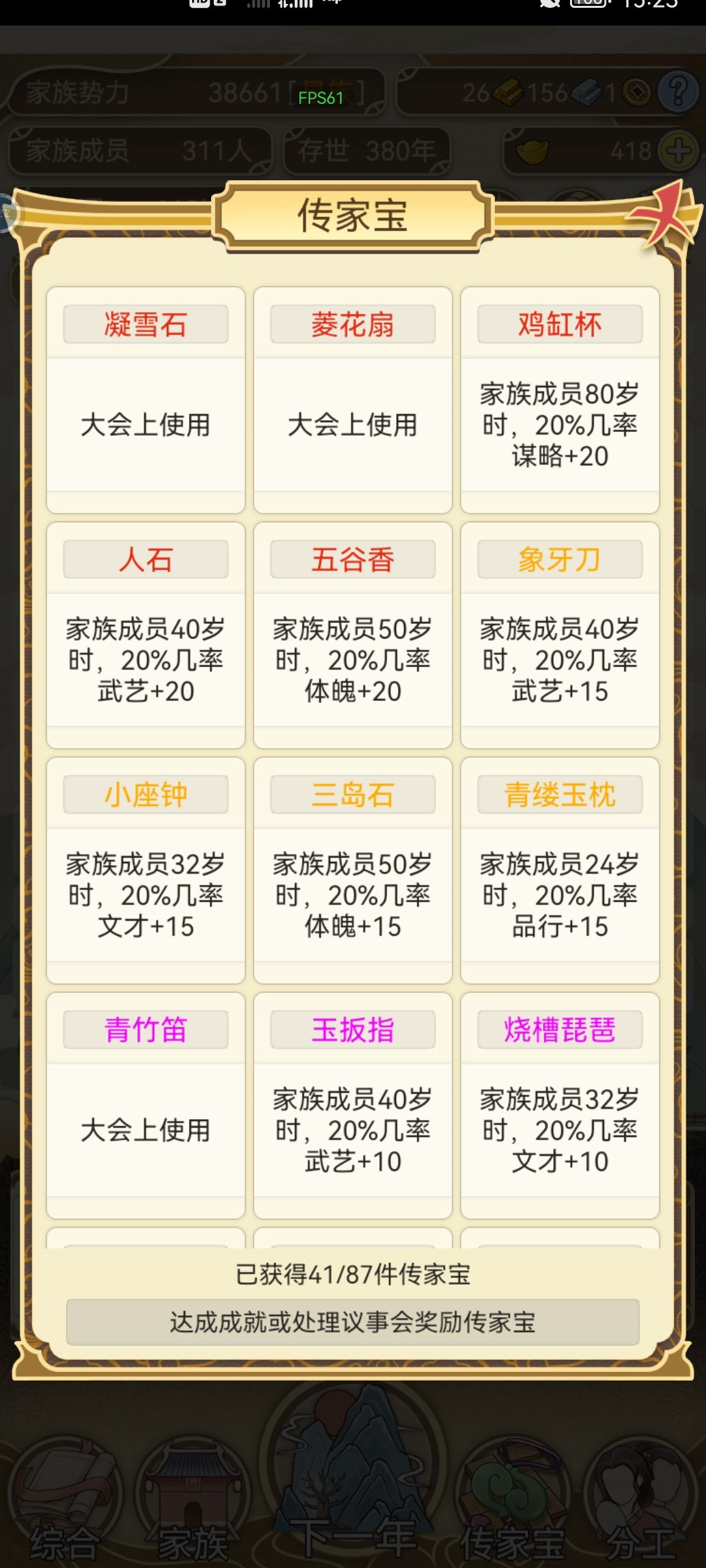 不间断肝了两天,手机肝的烫手。总结一下,元宝主要靠生孩子,除了宗祠其它不用,宗祠刷满很重要。自家生的娃全部习武,20岁后参军。天下里面相亲的有金色属性优先,其次选能入仕的。关于跳涯我搞了一段时间没出现传家宝,后面就全都搞钱了,30金后可以全跳。议事全部选同意,有几率出现传家宝。 家族300人后面太卡了,而且都是套娃每年耗时太长了。药园里的药可以给自己吃加体魄优先,不过我的都没吃过,全部存起来了。最后补充一下,图放不下了没上,五代以后基本上就不生了,六代全不生。所以活的太久也容易断层,后面就崩了。