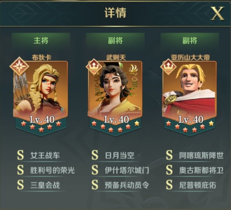 *搭配思路:以三皇会战为核心输出,由布狄卡自带技能配合伊什塔尔城门为三皇会战提供主要的属性叠加,然后再搭配其他属性提升的技能,让三皇会战的伤害达到最大化。并且搭配武则天可以很好的克制单核阵容,其次就是武则天搭配预备兵动员令可配合其自身决胜技能,可为队伍英雄施加8回合的治疗,可以很好的提高队伍的续航能力。搭配一个坦克吸收伤害,可以使队伍的整体稳定性更强。